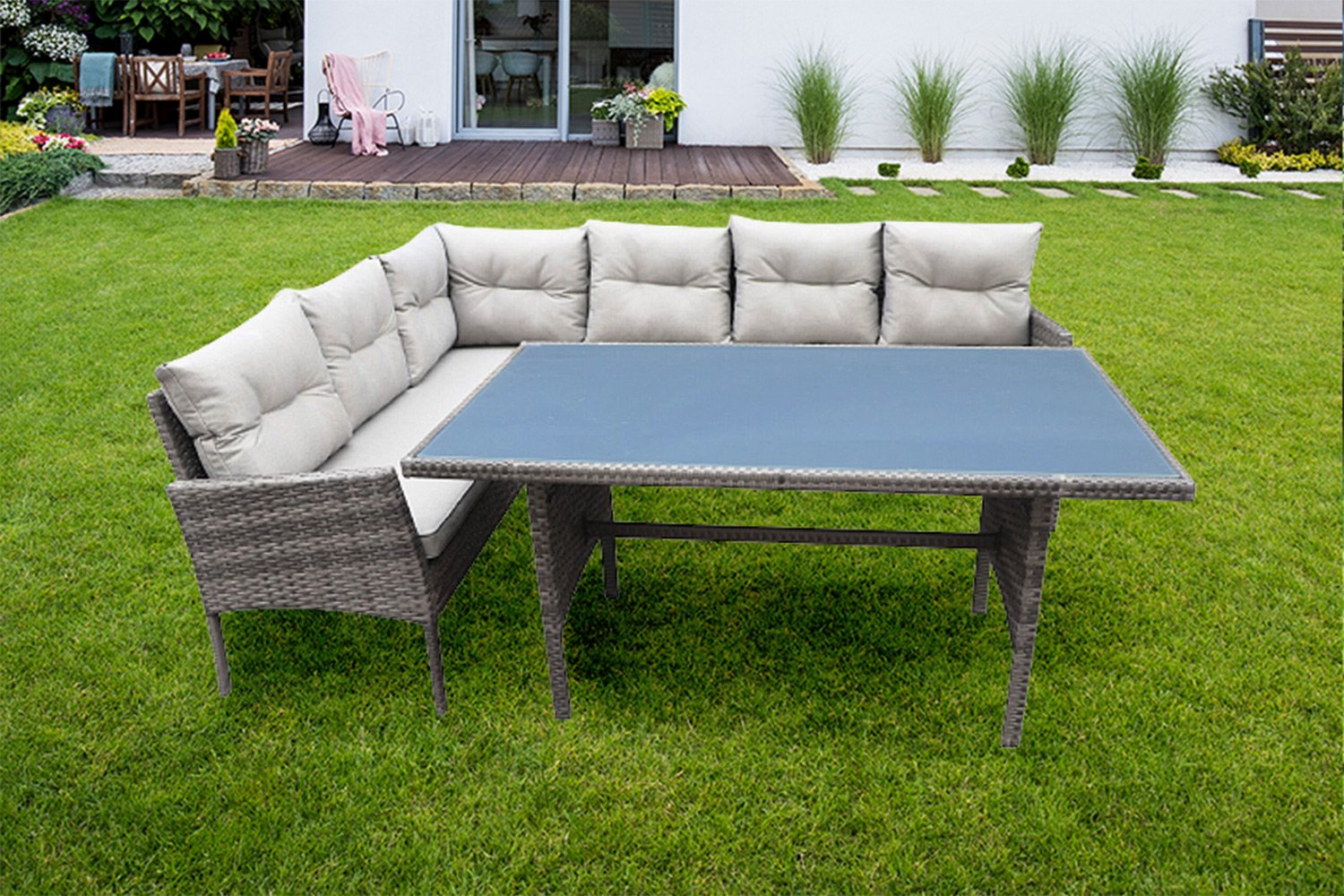 Набор садовой мебели представляет собой угловой диван с обеденным столиком, состоящий из стального каркаса, покрытого и соединенного искусственным ротангом – материалом синтетического происхождения, который предназначен для эксплуатации на улице.