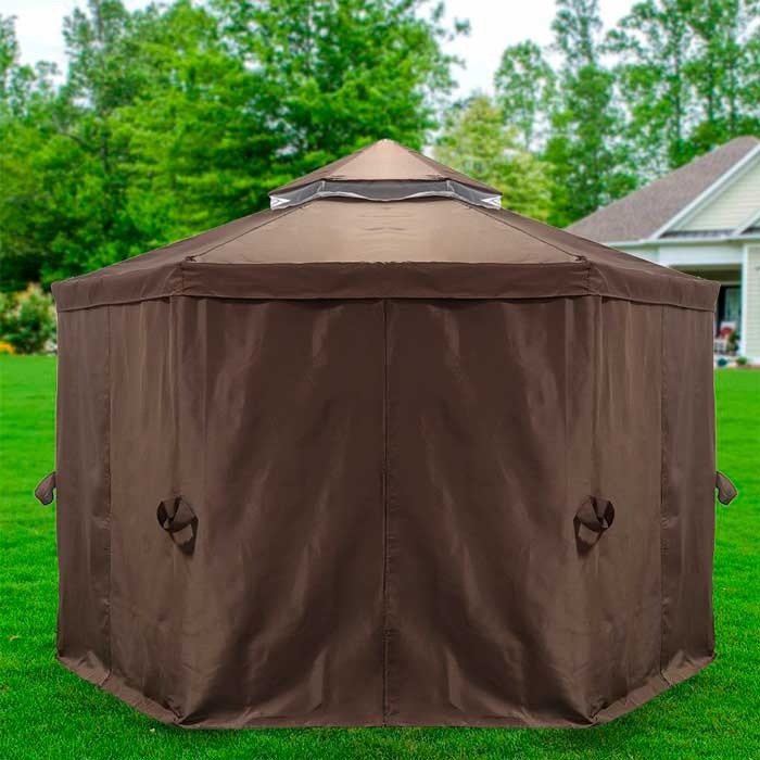 Хотим предложить вам приобрести такое изделие, как комплект для шестиугольного шатра. Данный комплект выполнен в коричневом цвете. В нём находится крыша-тент с клапаном для проветривания, плотные шторы, а также москитная сетка, которая защищает от насекомых. Это наилучший вариант в том случае, если вы хотите сделать свой отдых более комфортным. Комплект защитит вас от солнечных лучей, ветра, дождя, насекомых. Подойдёт комплект для размеров шатра 1,75 х 1,75 х 2,75 м. Крыша изготовлена из полиэстера с плотностью 160 г, а боковые стенки из полиэстера плотностью 140 г с сеткой.