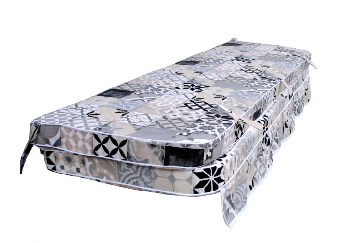Данный матрас предназначен для садовой качели. Такие матрасы изготавливаются из универсальных тканей, изготовленных в Испании. Благодаря тому, что в такой ткани огромный процент натуральных волокон, она замечательно пропускает воздух, а также является максимально приятной на ощупь. Эта ткань устойчива к появлению пятен, она с лёгкостью разглаживается. Наполнитель изготовлен из пенополиуретана вторичного вспенивания. Спинка, а также сиденье матраса выполнены на молнии, поэтому наполнитель с лёгкостью можно вынуть, а чехол легко можно постирать. Для того, чтобы матрас надёжно держался на качели, на нём есть специальные завязки по бокам.